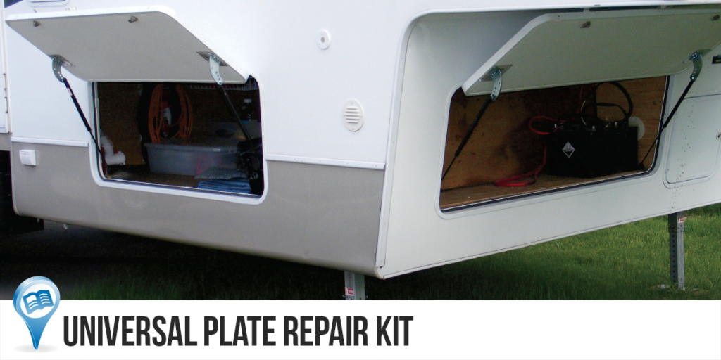 The manufacturer of this product says: “The plate repair kit includes an adhesive-backed galvanized plate, primer and screws to reinforce the back of an RV door where existing spring brackets have failed. The plates can be used to mend or patch any flat surface.”