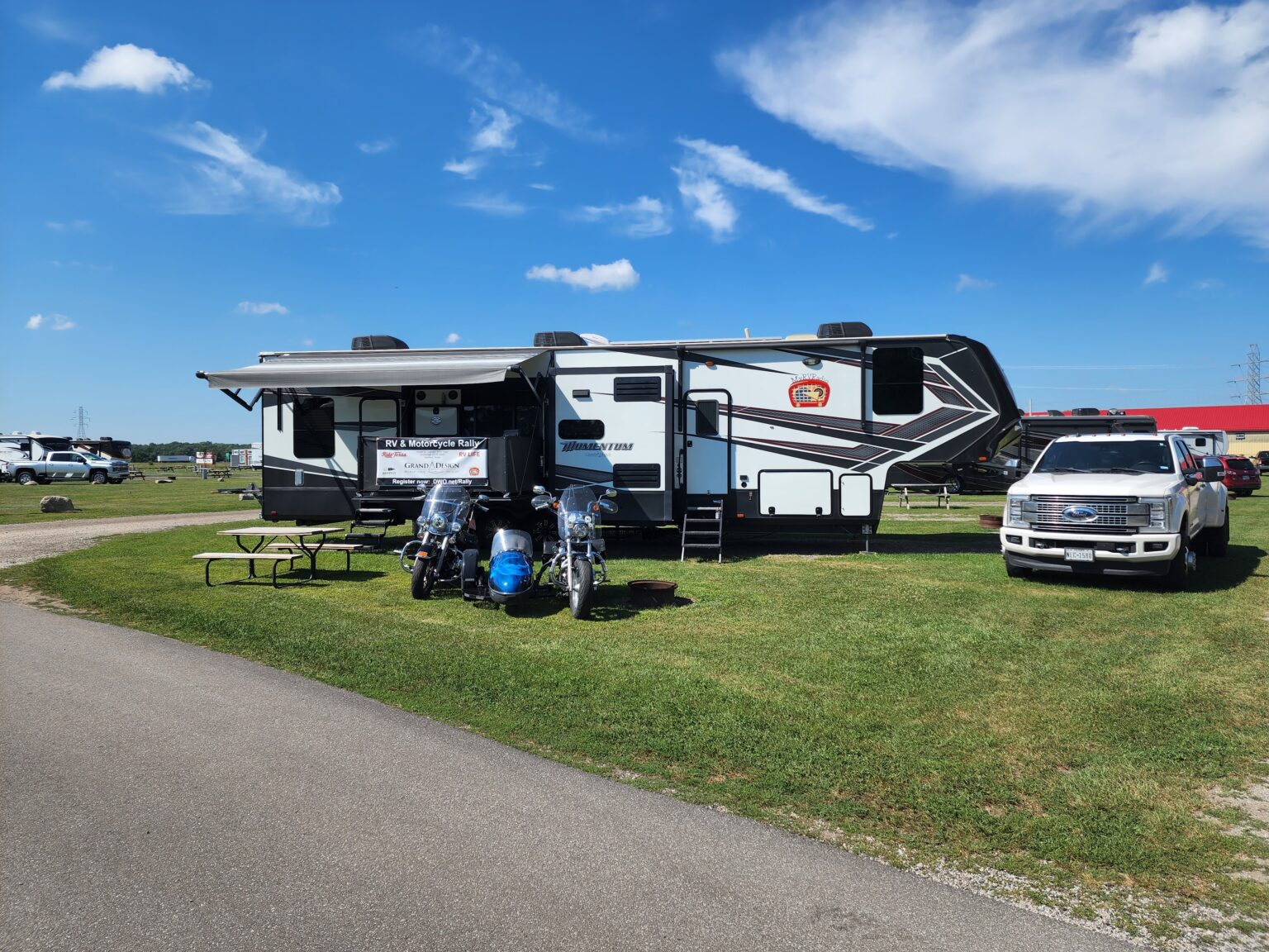 My husband Will and I travel full-time in a 44ft. fifth-wheel toy hauler. We haul it with a large dually truck. Our total length is about 65 feet. We knew we would not stay in most national or state parks with this size, but we work from the rig full-time and haul our motorcycles, so we wanted the space. The past five years brought us what we sought- a way to ride through the United States, a different location, a different view from our RV, and our motorcycles. Because I have a sidecar, it takes up all the toy-hauling space in our rig.